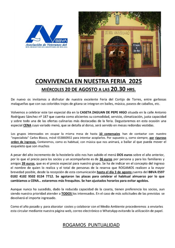 Tras numerosos años, reservamos de nuevo, para repetir la celebración de nuestra feria en la Caseta ZAGUAN DE PEPE HIGO que reunía todas las condiciones deseadas como lugar, aire acondicionado, espacio, música y sobre todo un excelente menú con buen servicio y precio que se destacaban sobre la mayoría de casetas